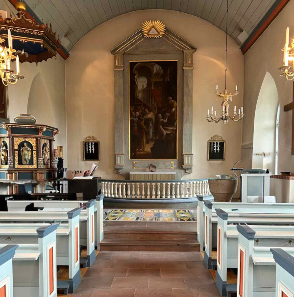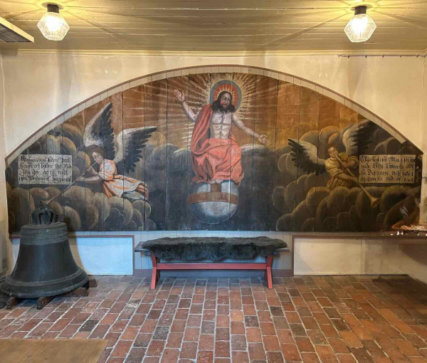Den här bilden möts vi av när vi kommer innanför Vapnökyrkans port och befinner oss i vapenhuset.